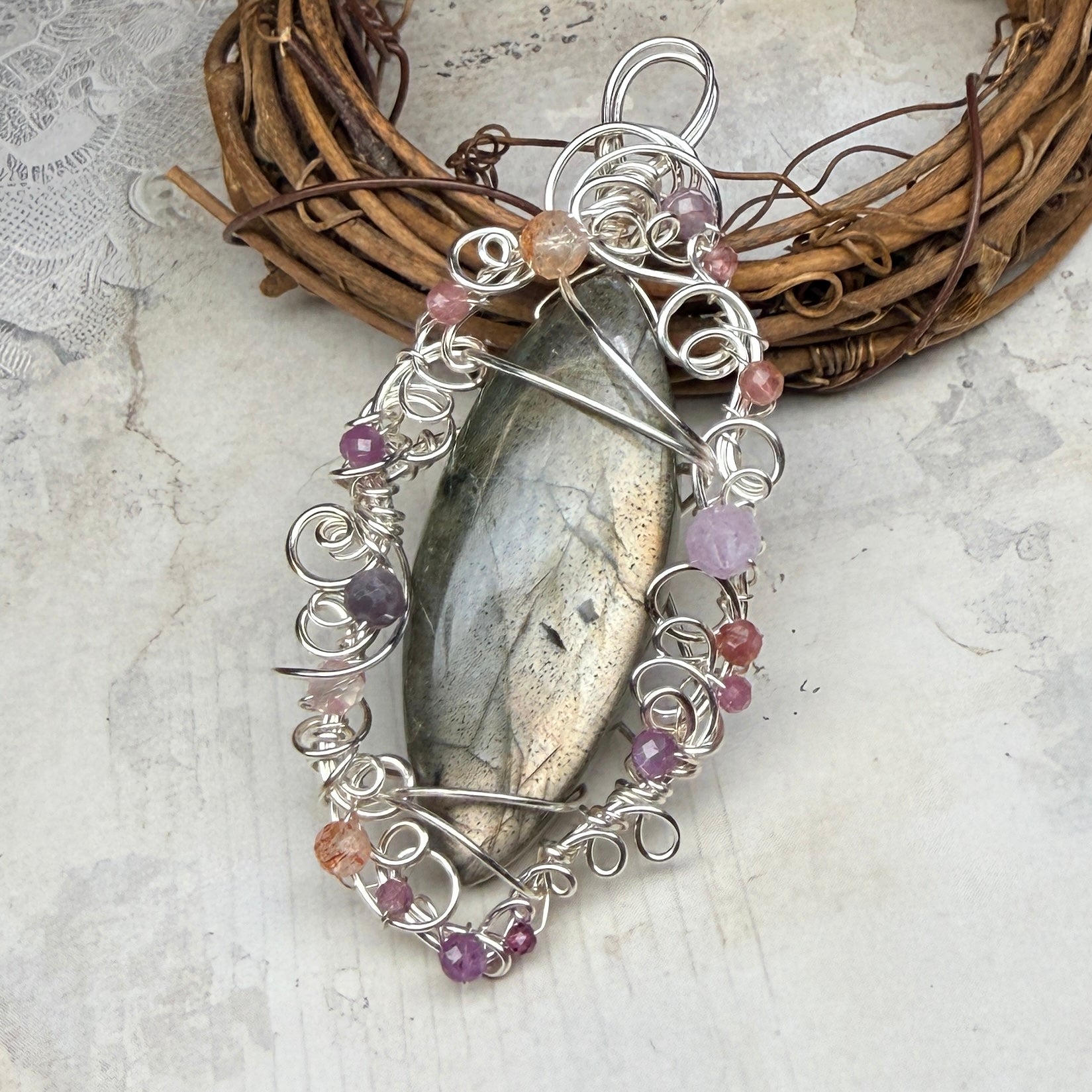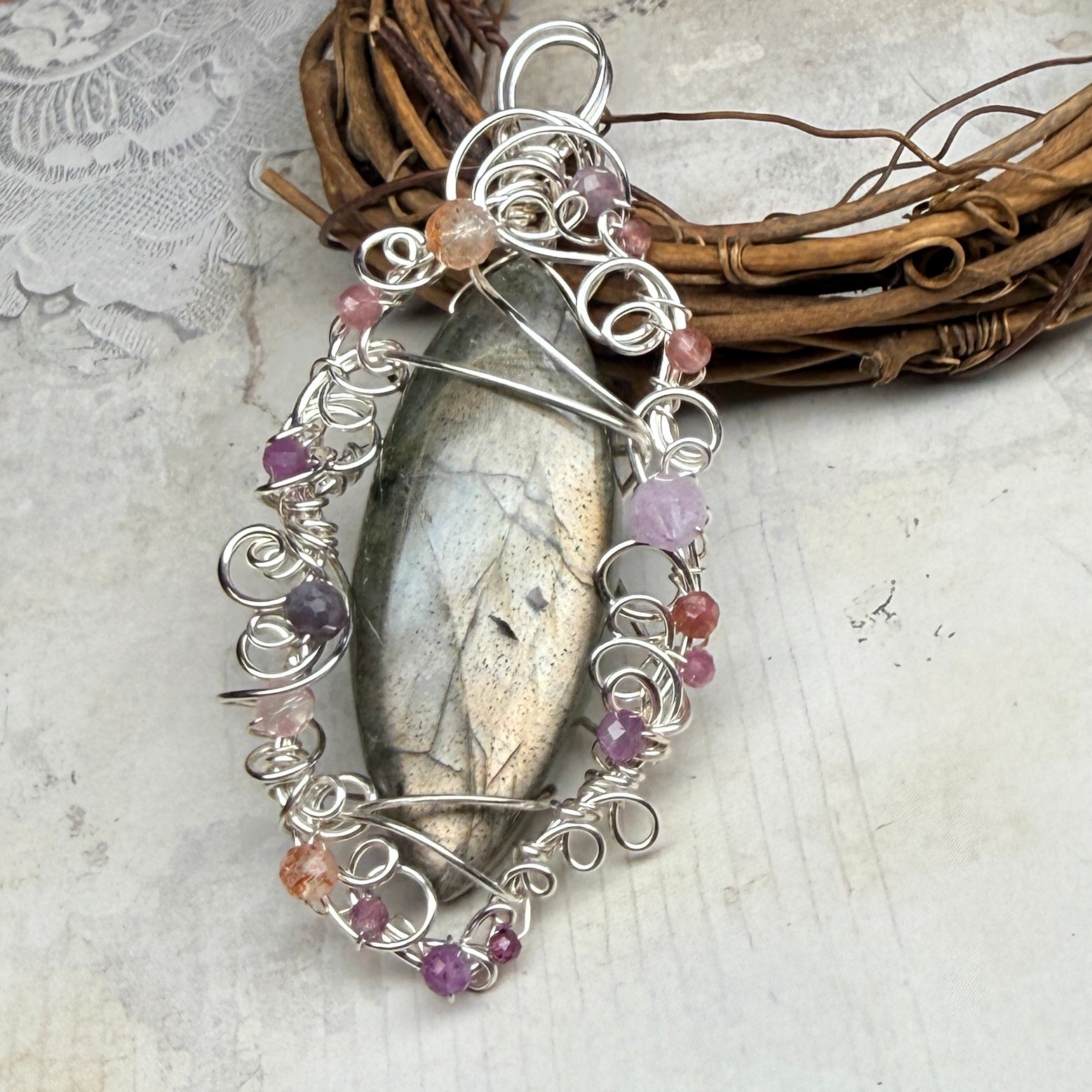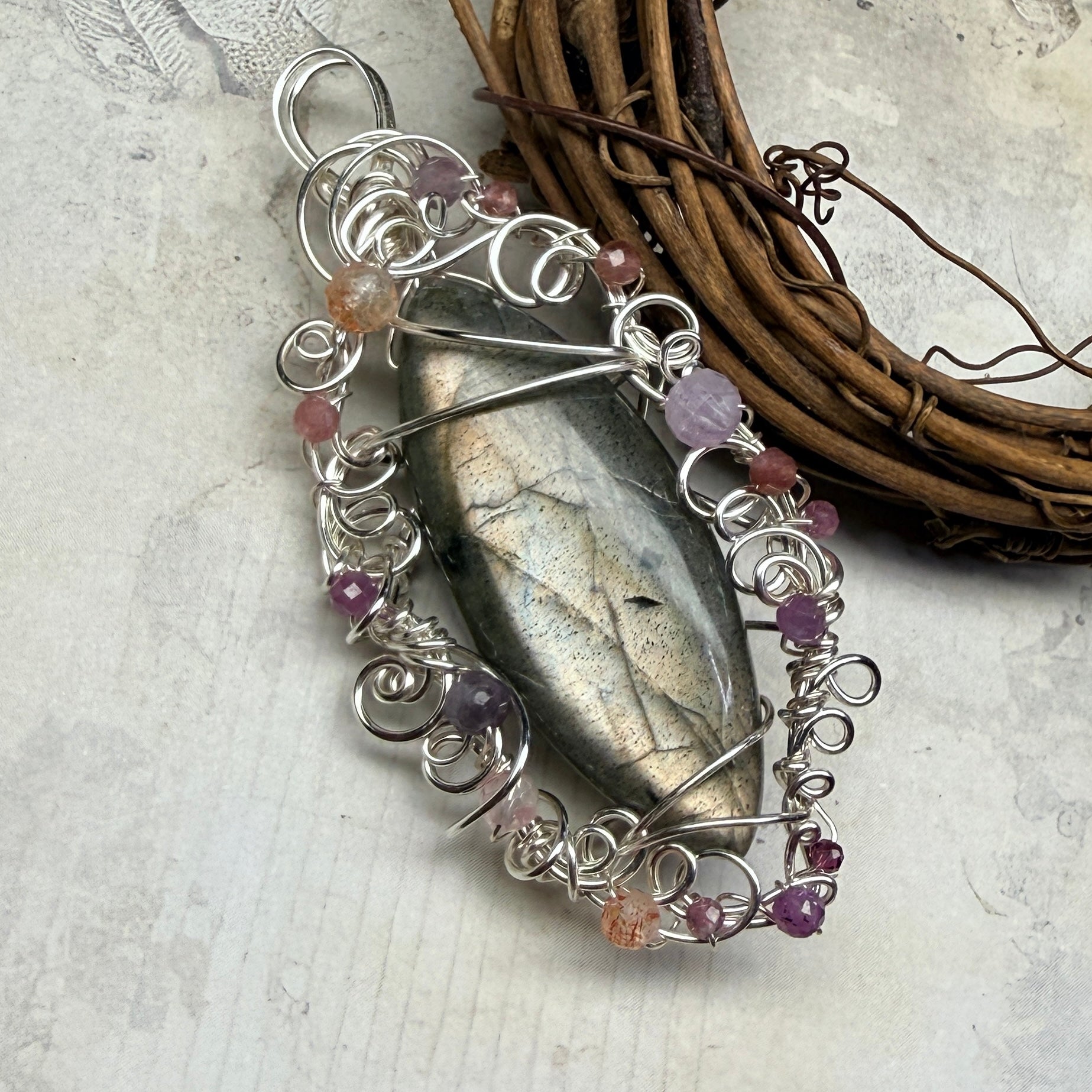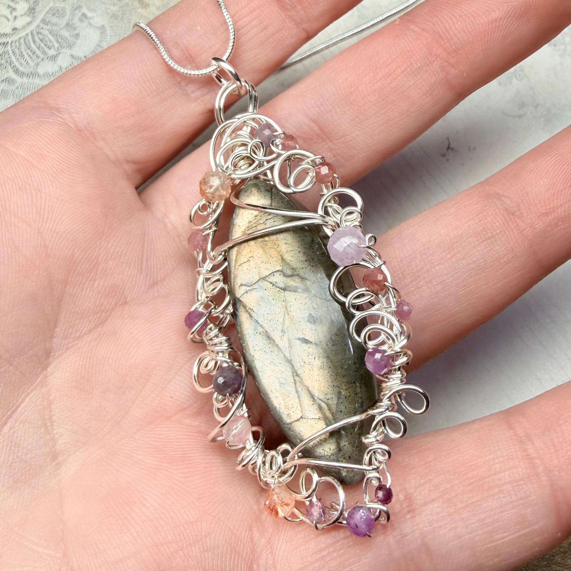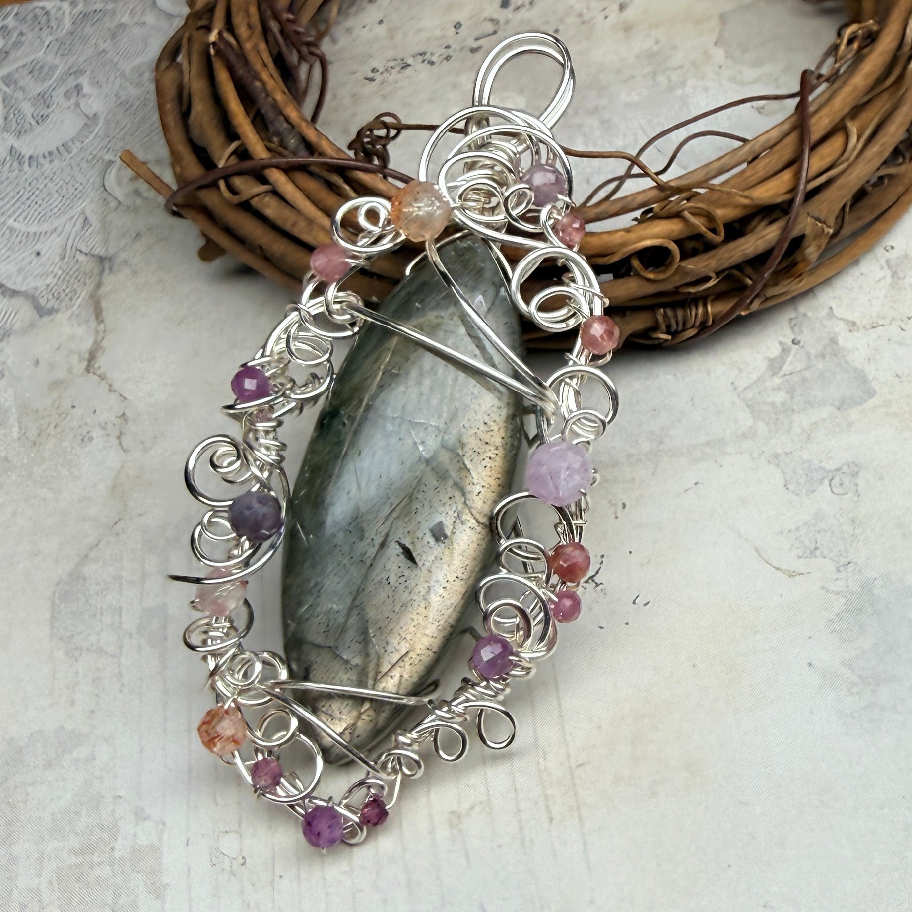 Labradorite with an unusual silvery-pink flash, set in silver wire accented with pink tourmaline, pink sapphire, sunstone, andesine, kunzite, and garnet. One of a kind.