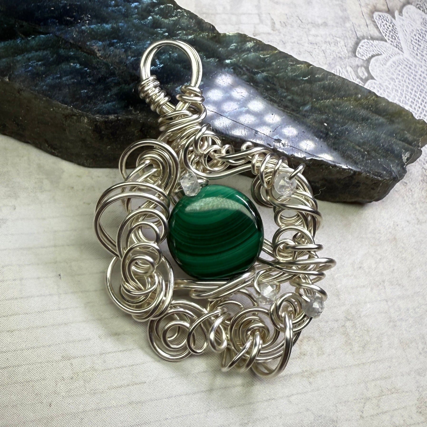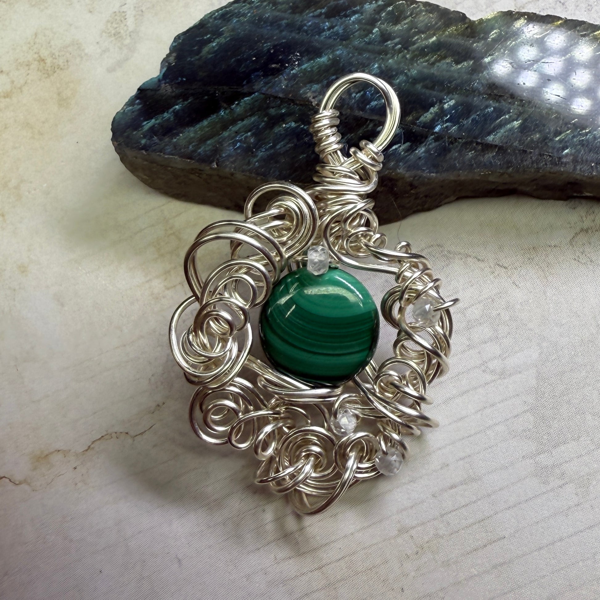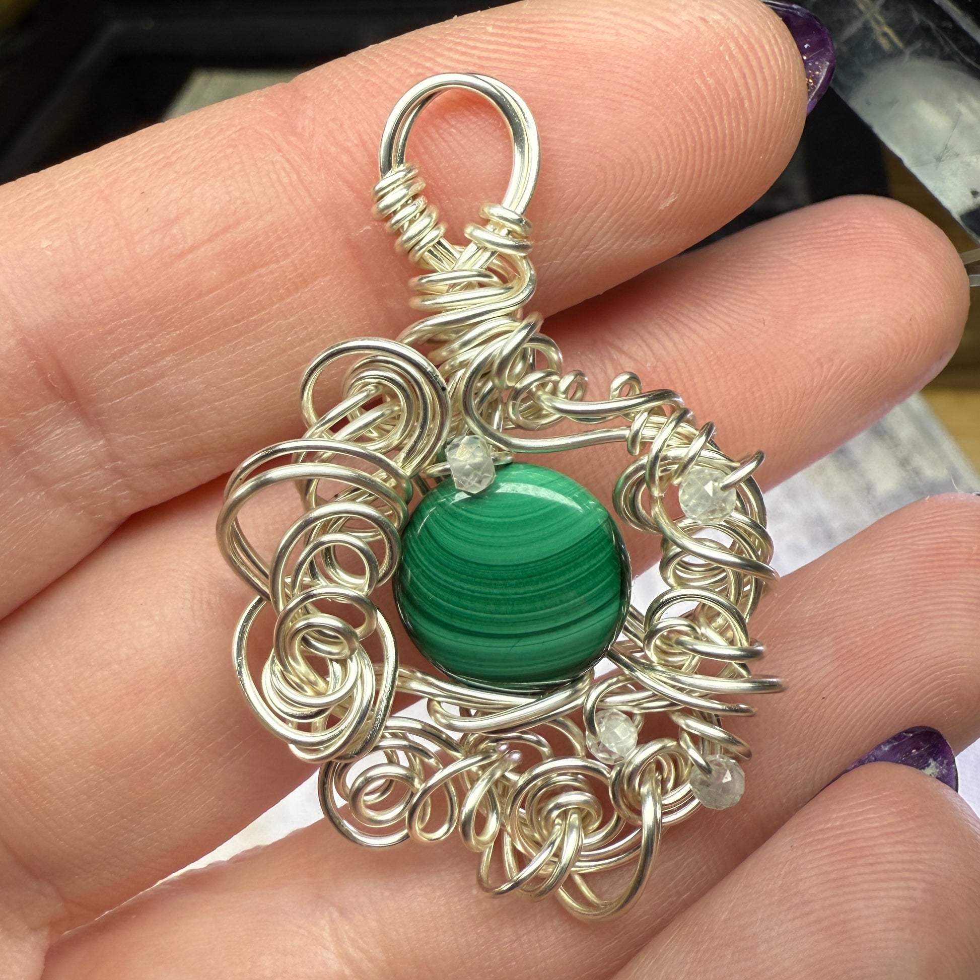 This piece of malachite is gorgeous when viewed straight-on, but if you tip it forwards or backwards a fascinating chatoyant effect appears, rendering the darker bands across the center almost invisible. Truly one of a kind. It’s accented with tiny sparkly white zircon beads.