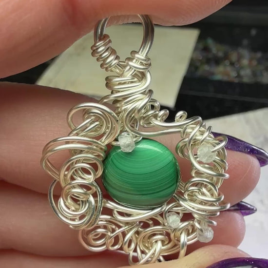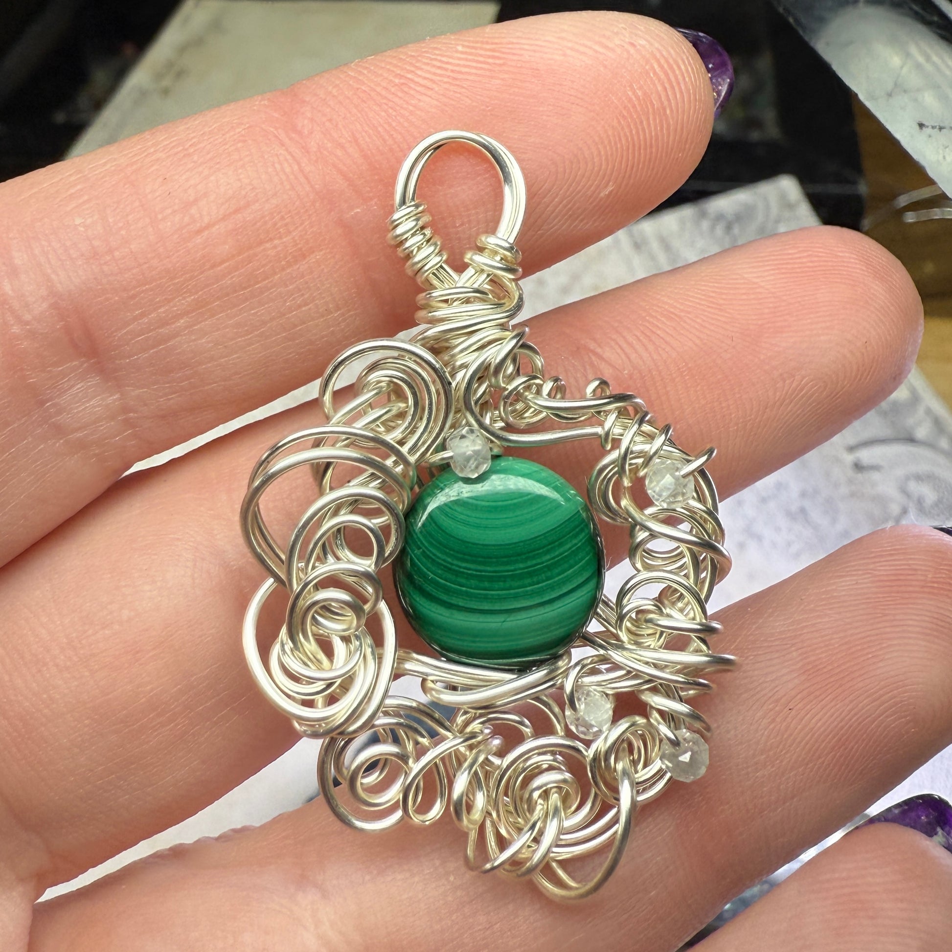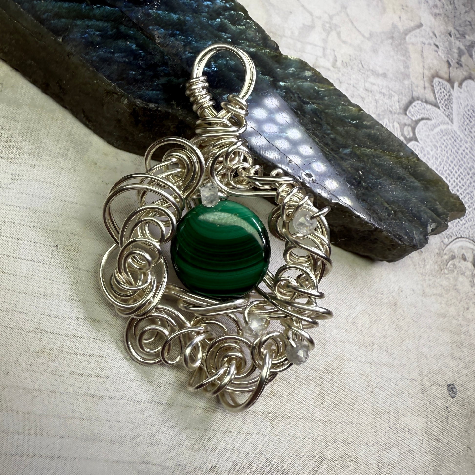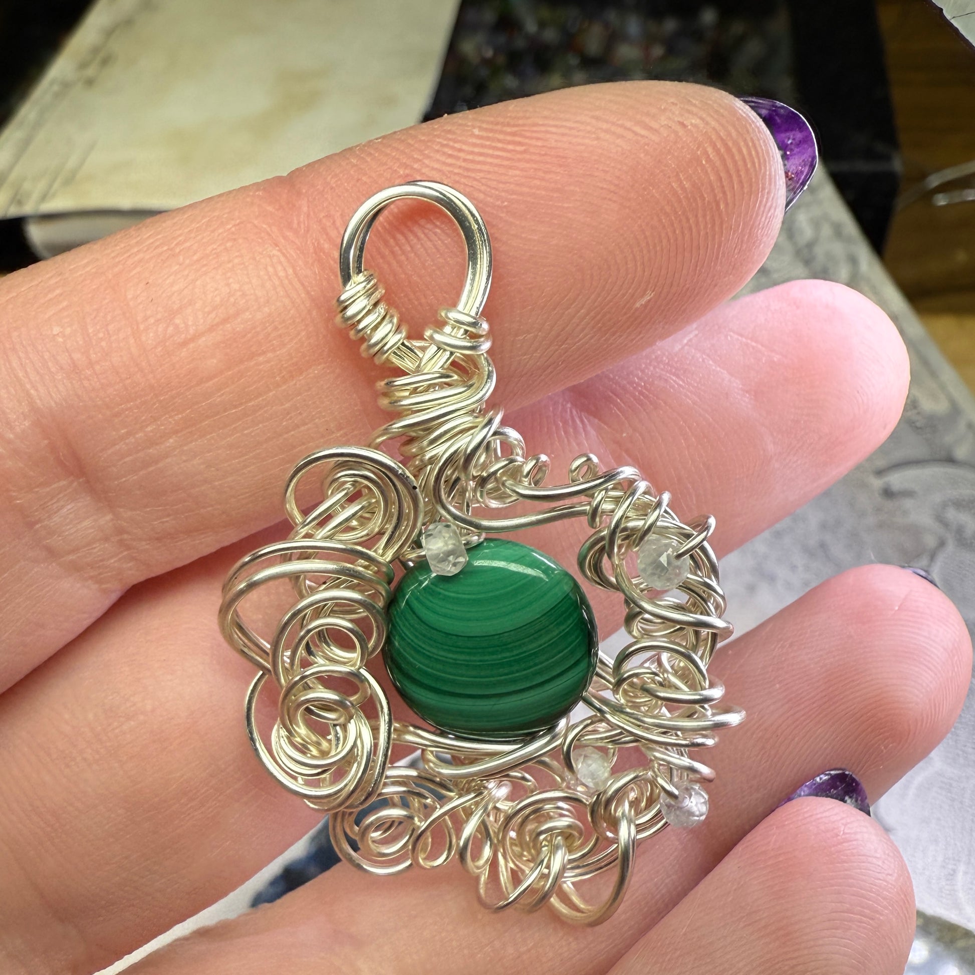 This piece of malachite is gorgeous when viewed straight-on, but if you tip it forwards or backwards a fascinating chatoyant effect appears, rendering the darker bands across the center almost invisible. Truly one of a kind. It’s accented with tiny sparkly white zircon beads.