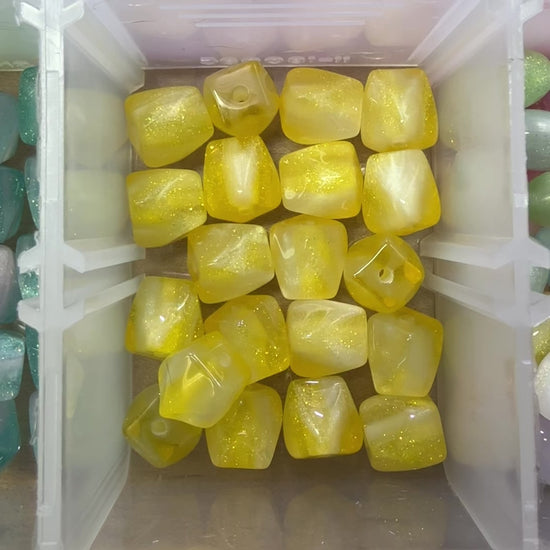 The color change is even more pronounced outdoors in sunlight - the photo with all 12 against a black background was taken indoors, and the photo with all 12 in my hand was taken outdoors in full sun. The video of all 12 shows them changing in the sunlight after being removed from a dark container, and the video of just the yellow beads shows them changing after being exposed to a UV flashlight.