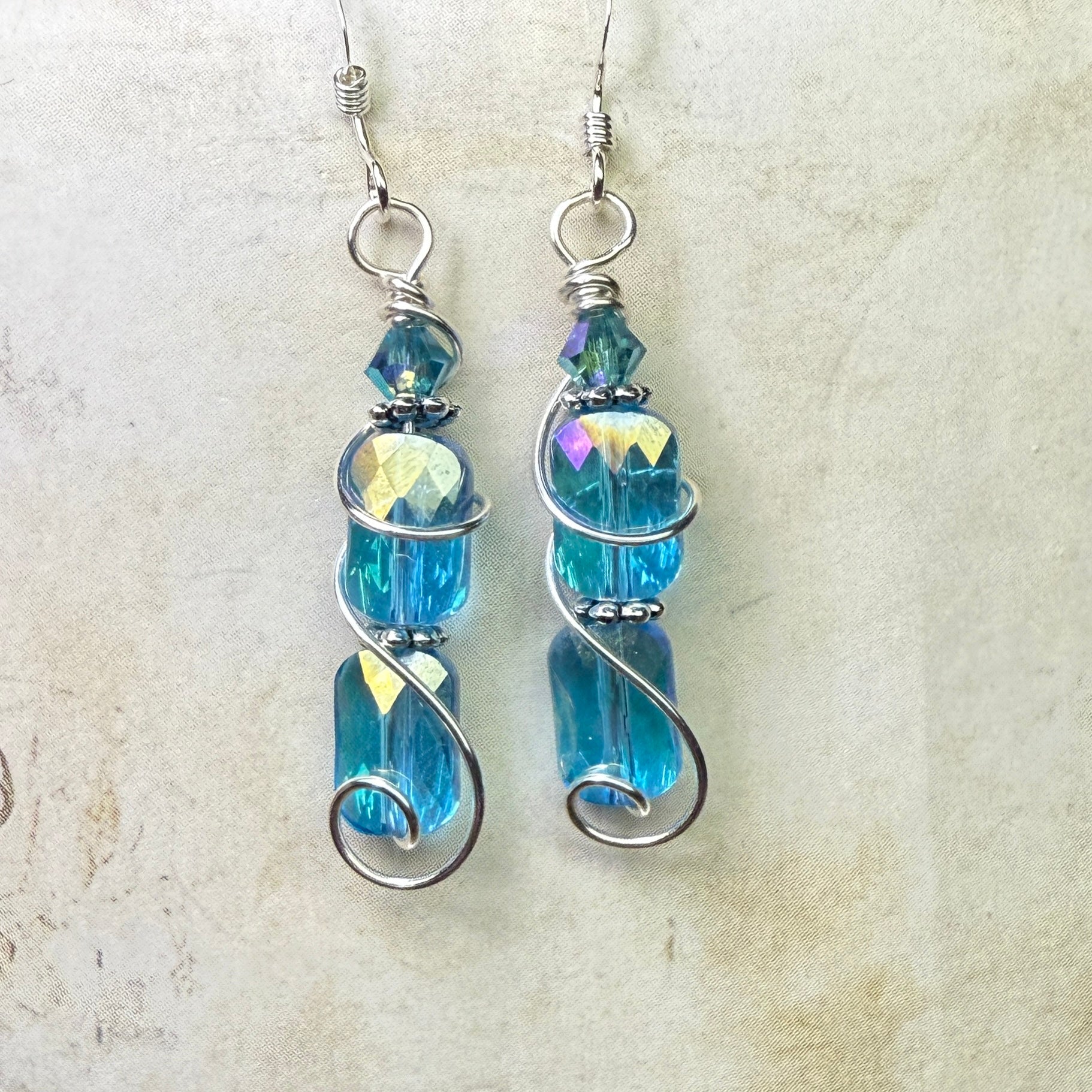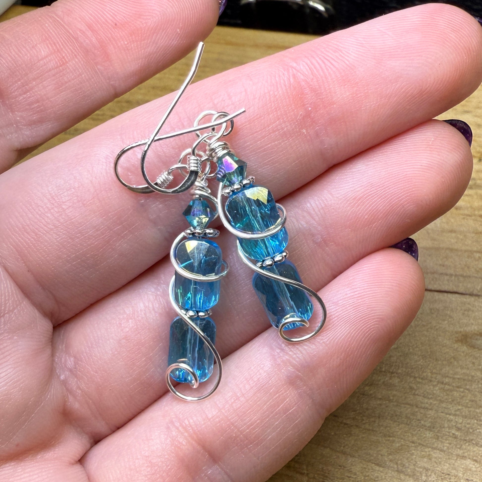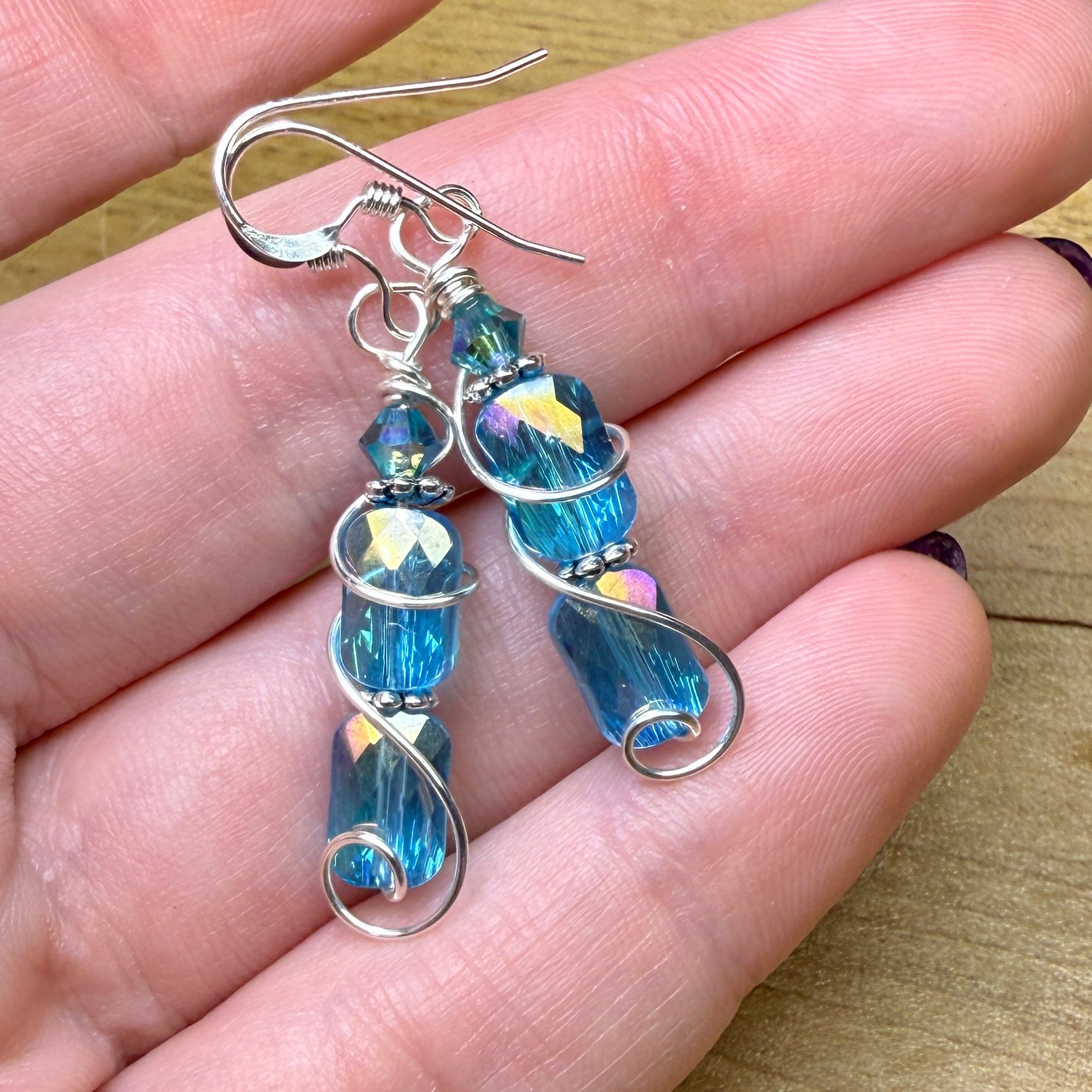 Even prettier in person - bright teal glass with a lightly iridescent coating, and tiny bicone crystals in silver wire. Limited edition, please allow for very minor variations from pair to pair.