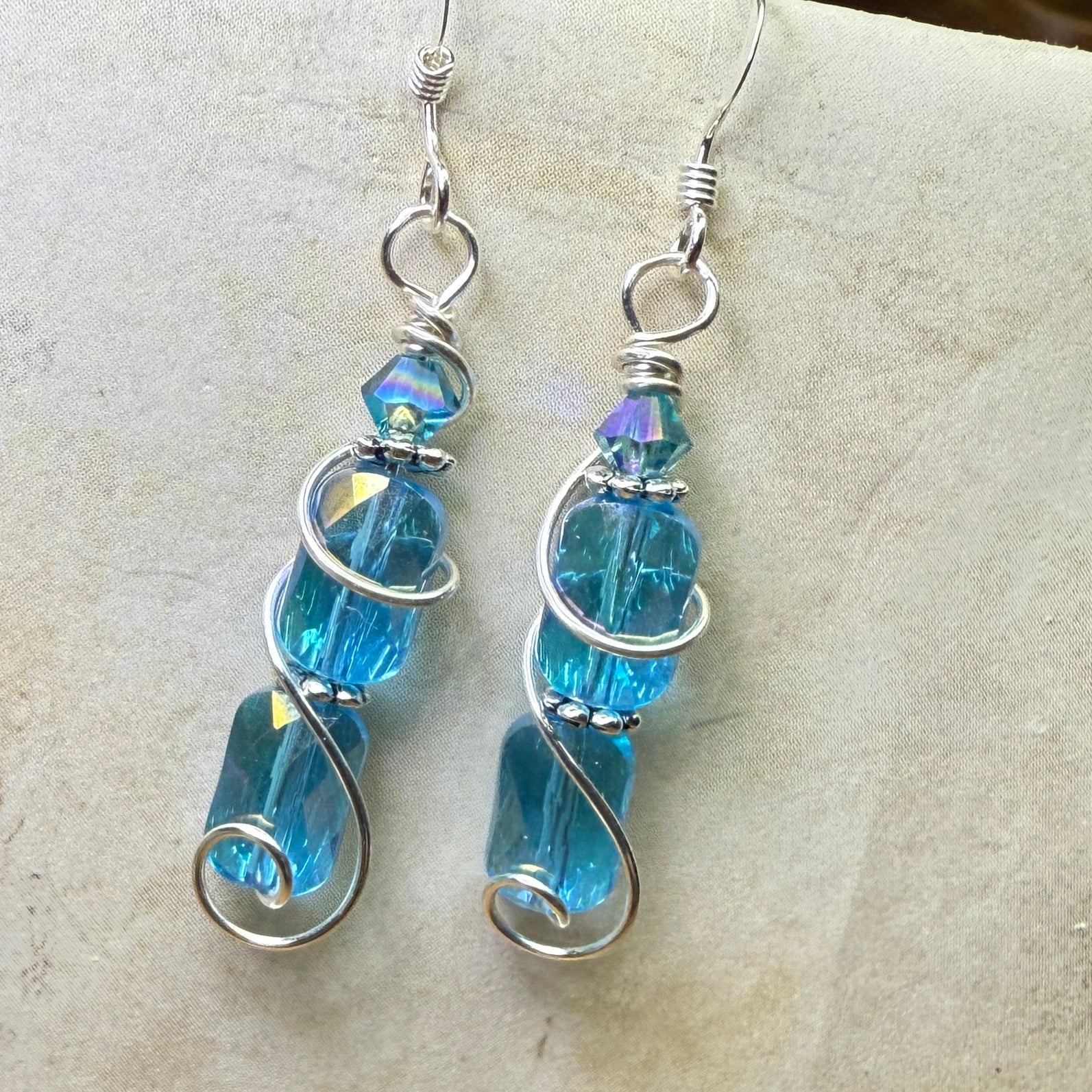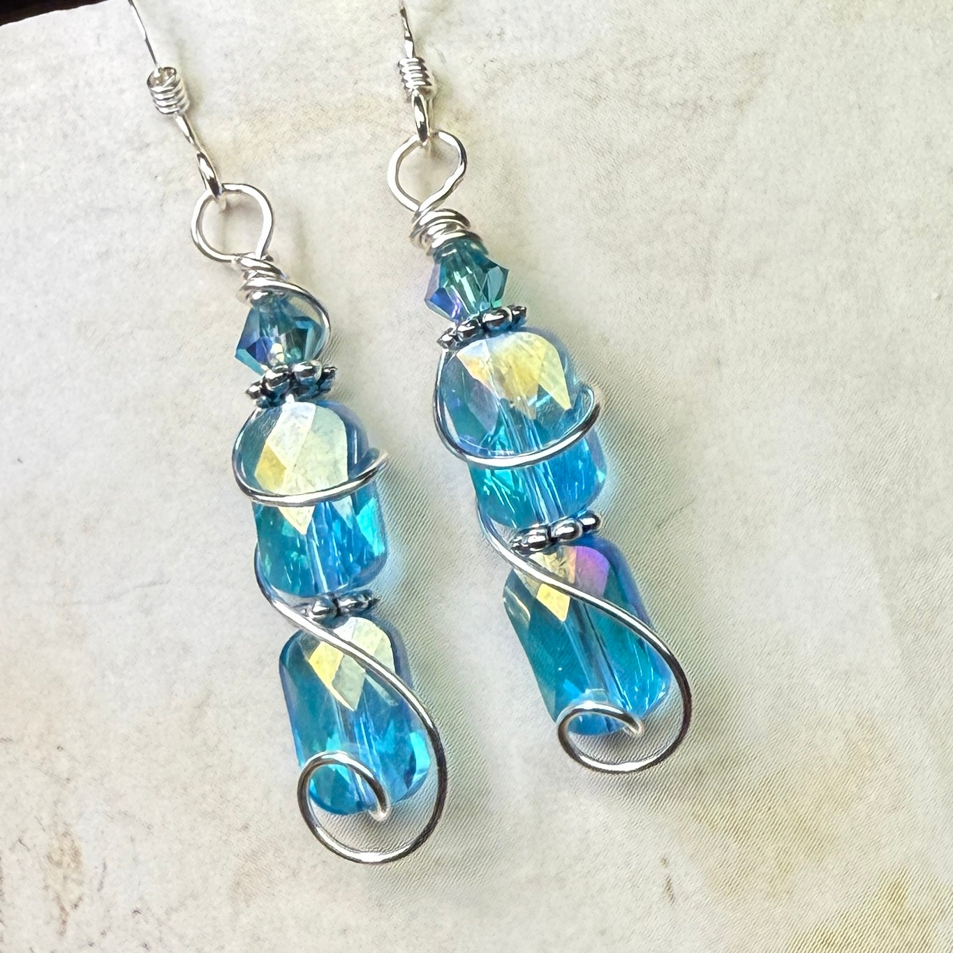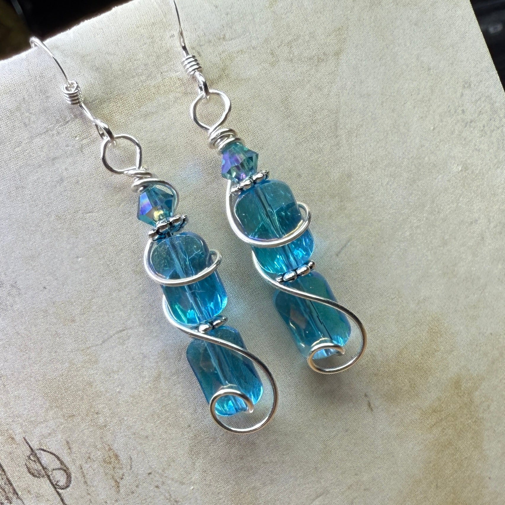 Even prettier in person - bright teal glass with a lightly iridescent coating, and tiny bicone crystals in silver wire. Limited edition, please allow for very minor variations from pair to pair.