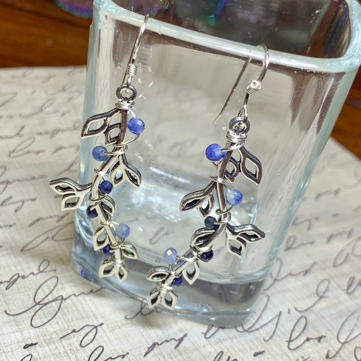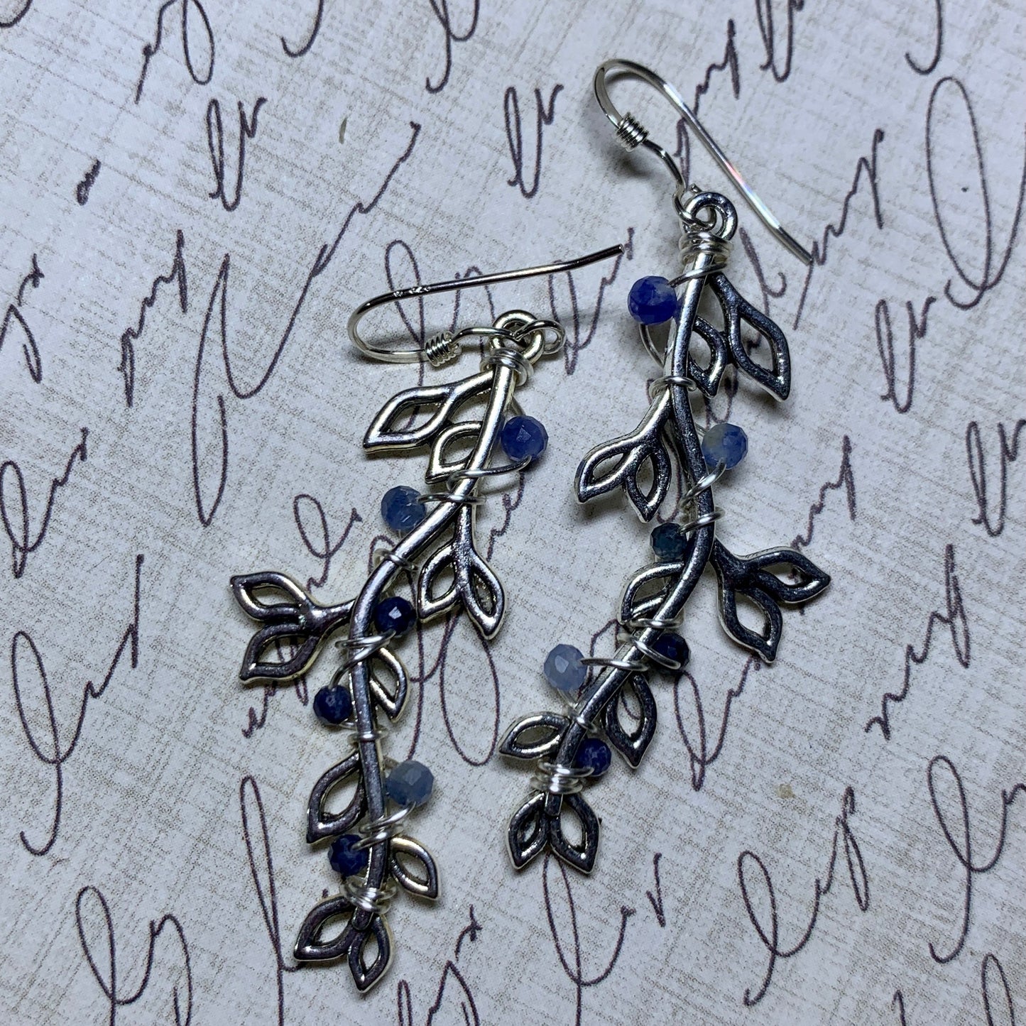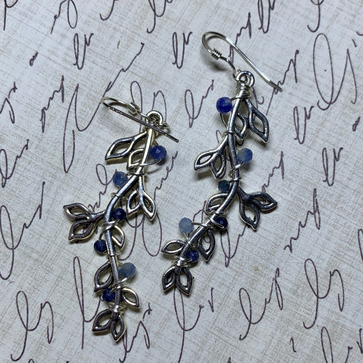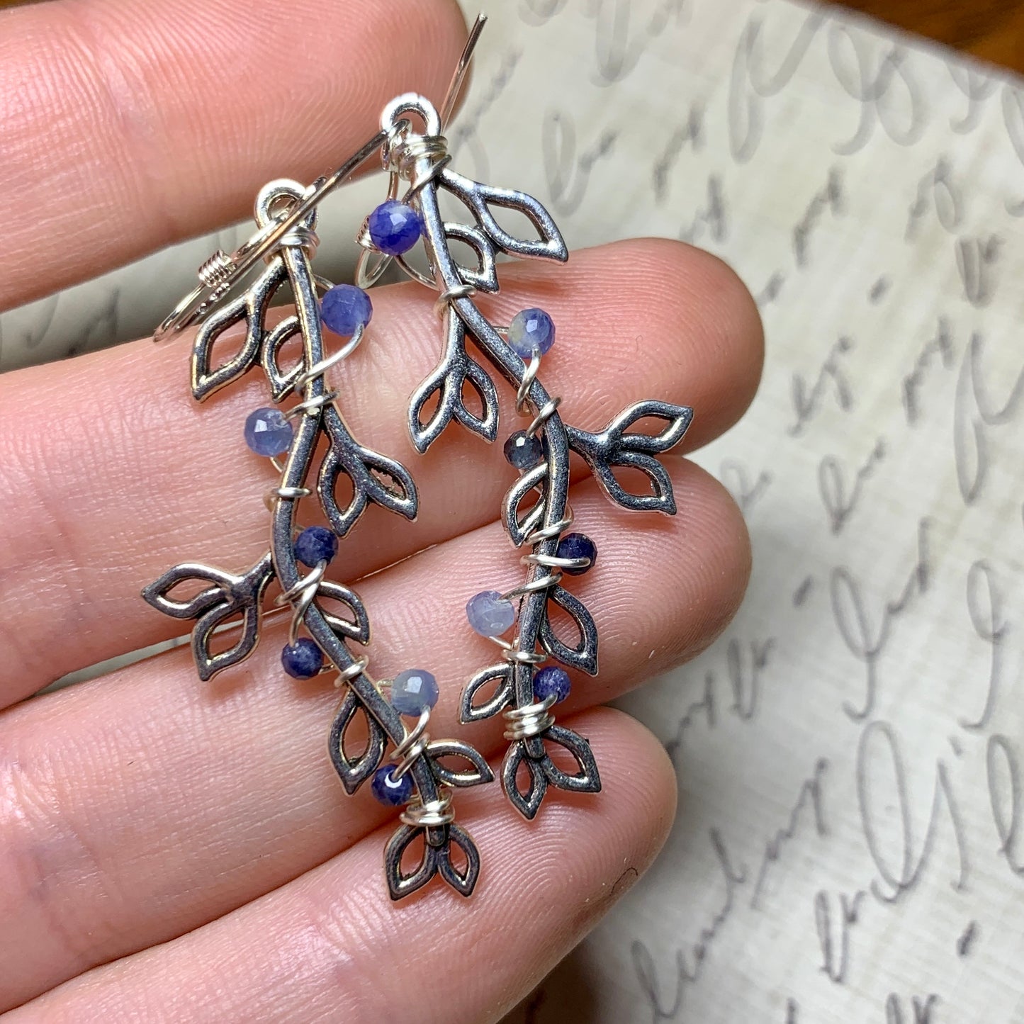 Sapphire, kyanite, and sodalite on silvertone leaf charms.