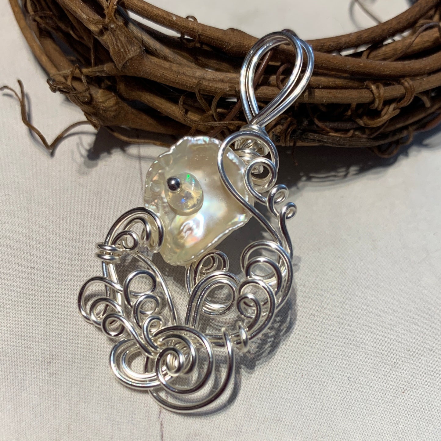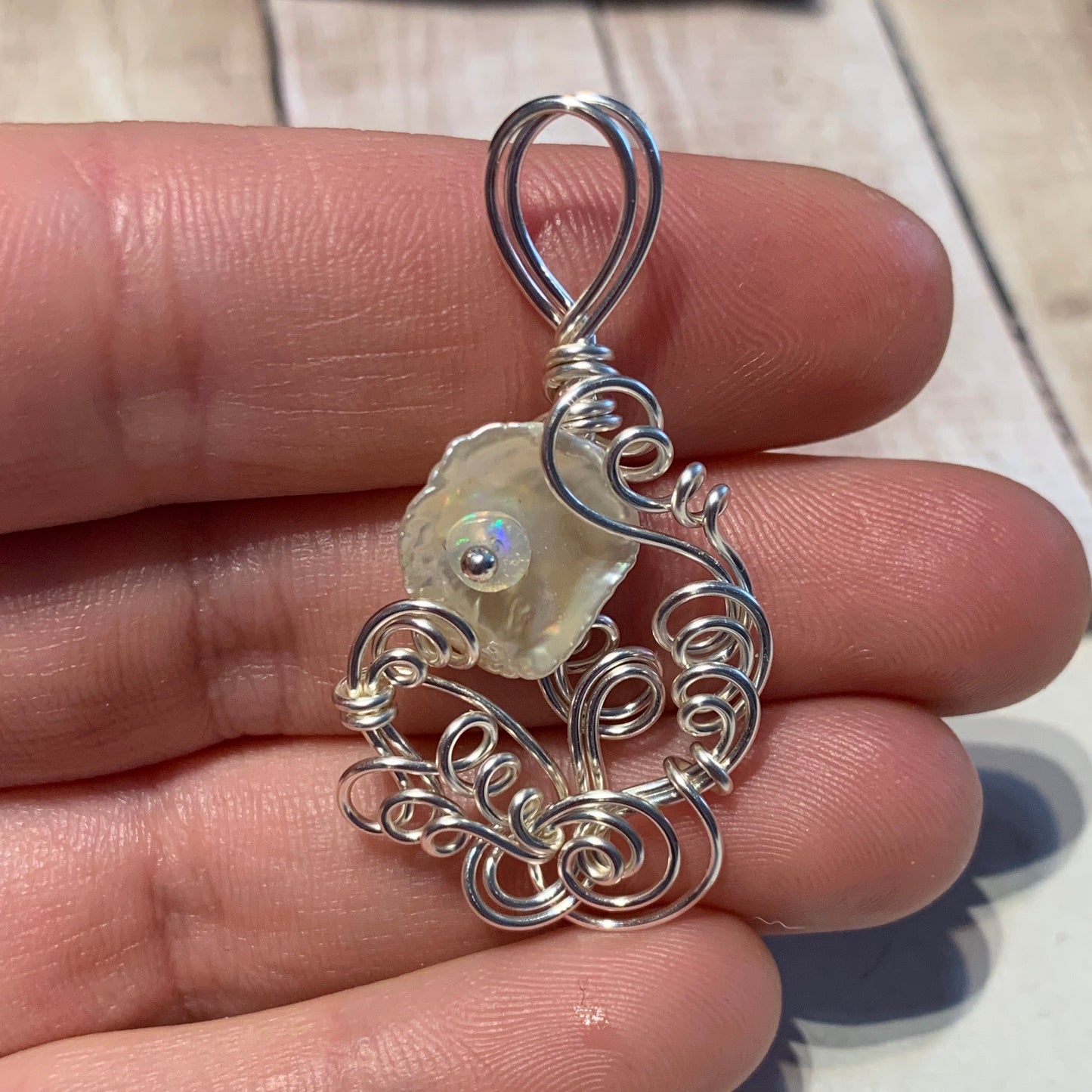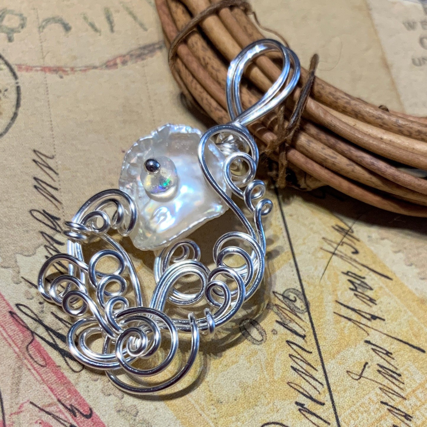 A beautiful baroque petal pearl with a tiny water-clear opal full of blue and green sparks nestled into the center, set in organic swoops of silver wire.