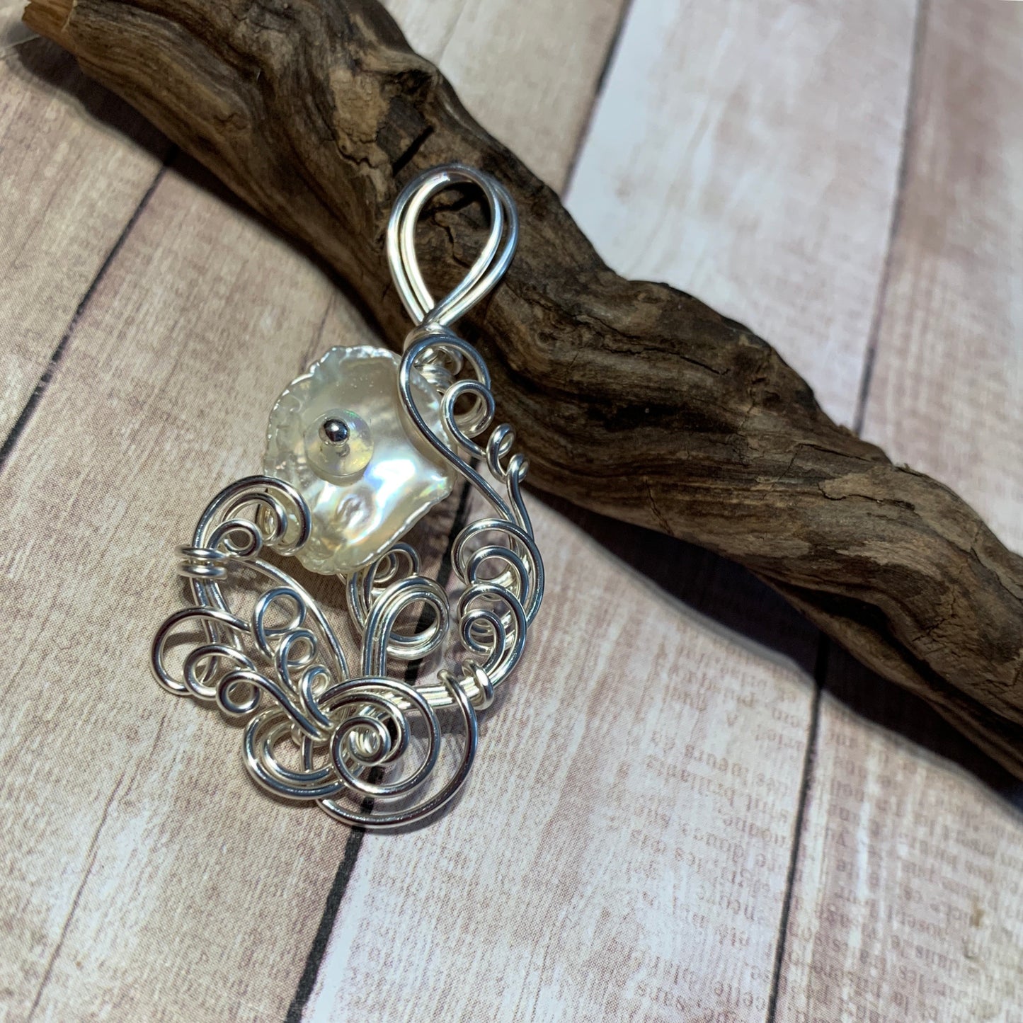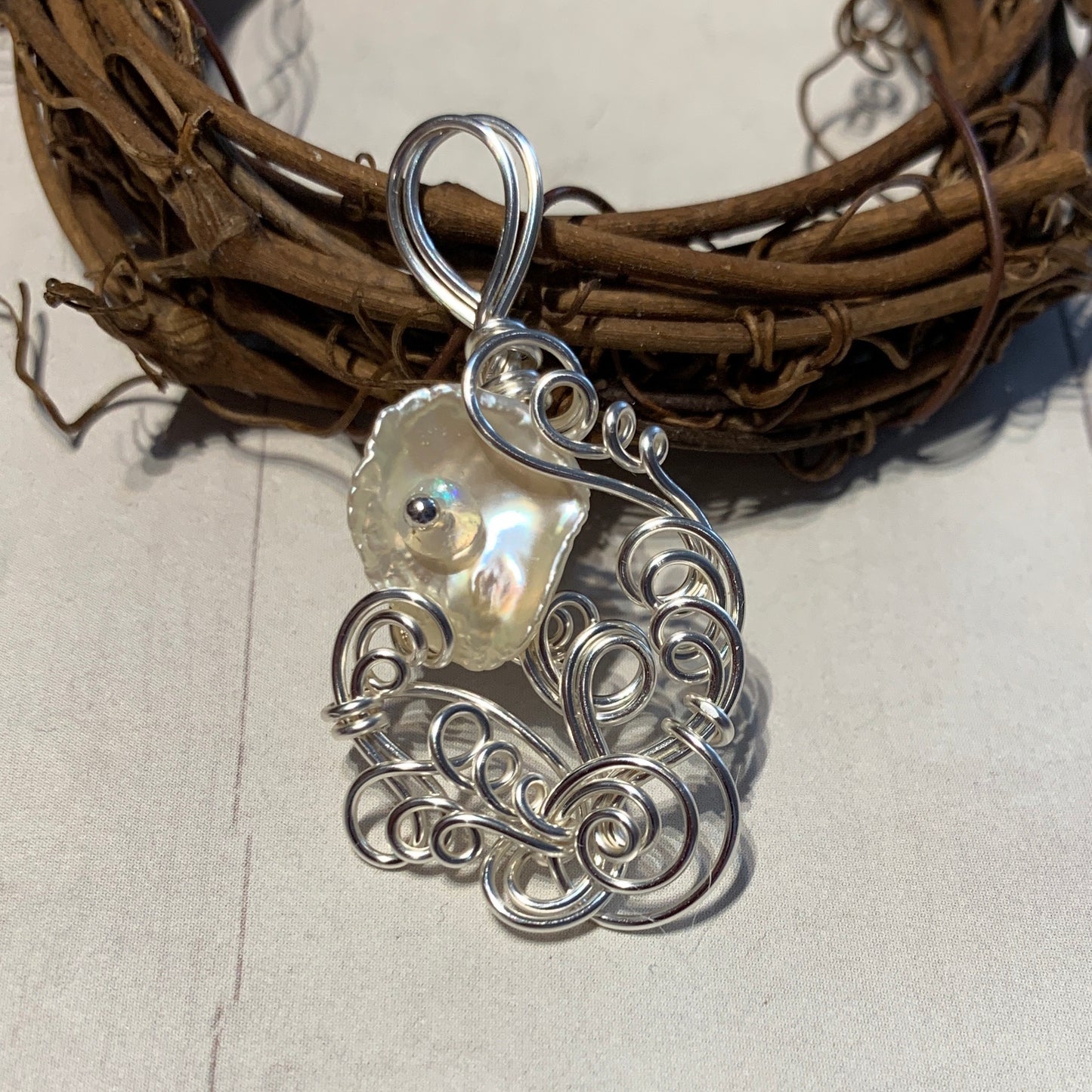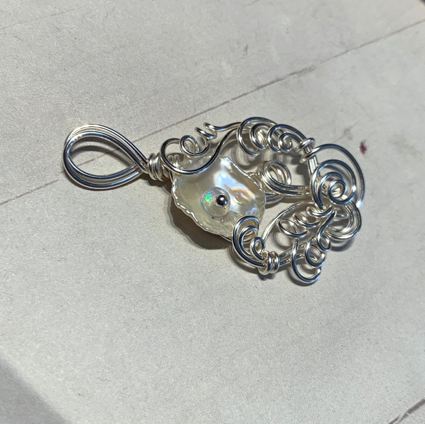 A beautiful baroque petal pearl with a tiny water-clear opal full of blue and green sparks nestled into the center, set in organic swoops of silver wire.